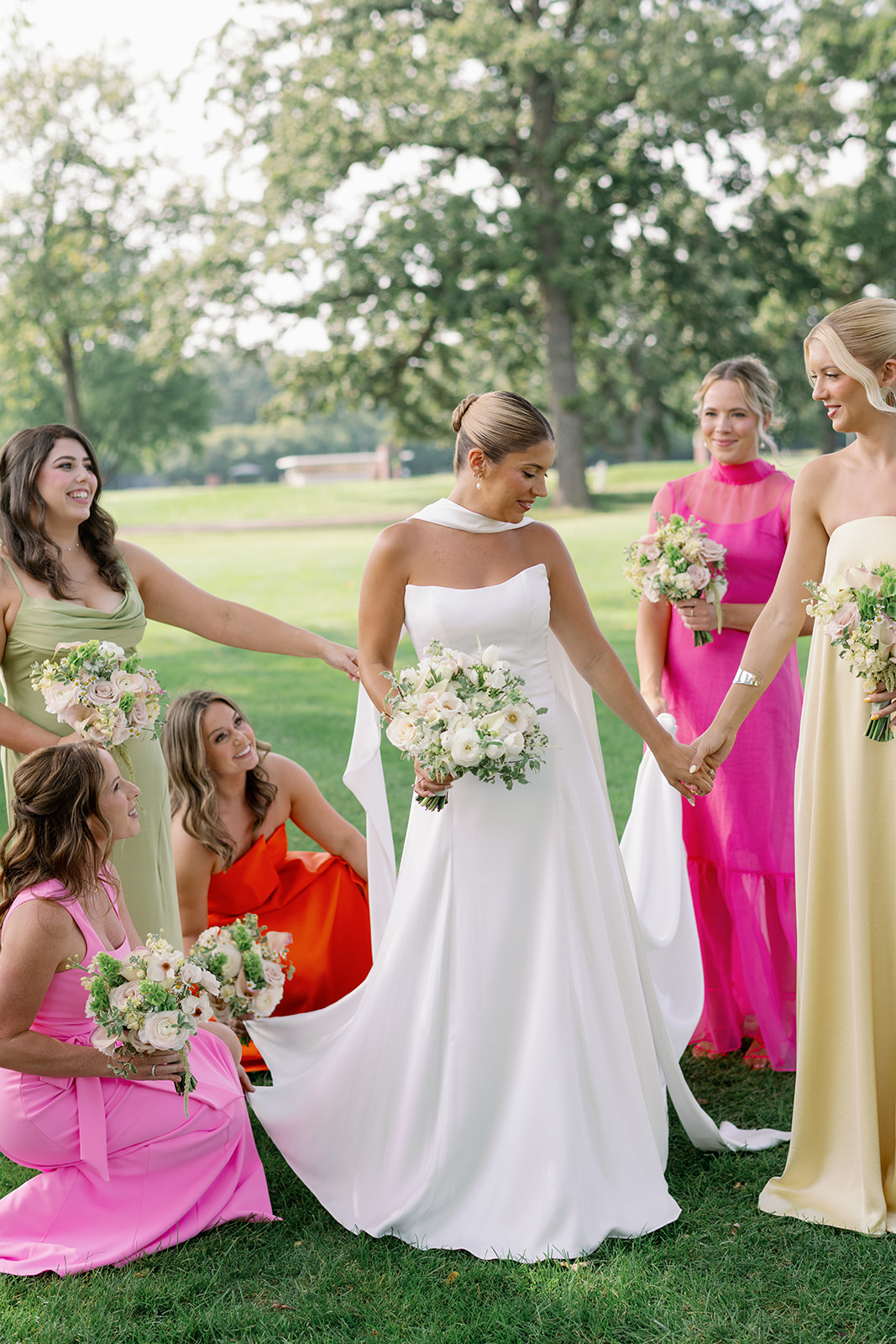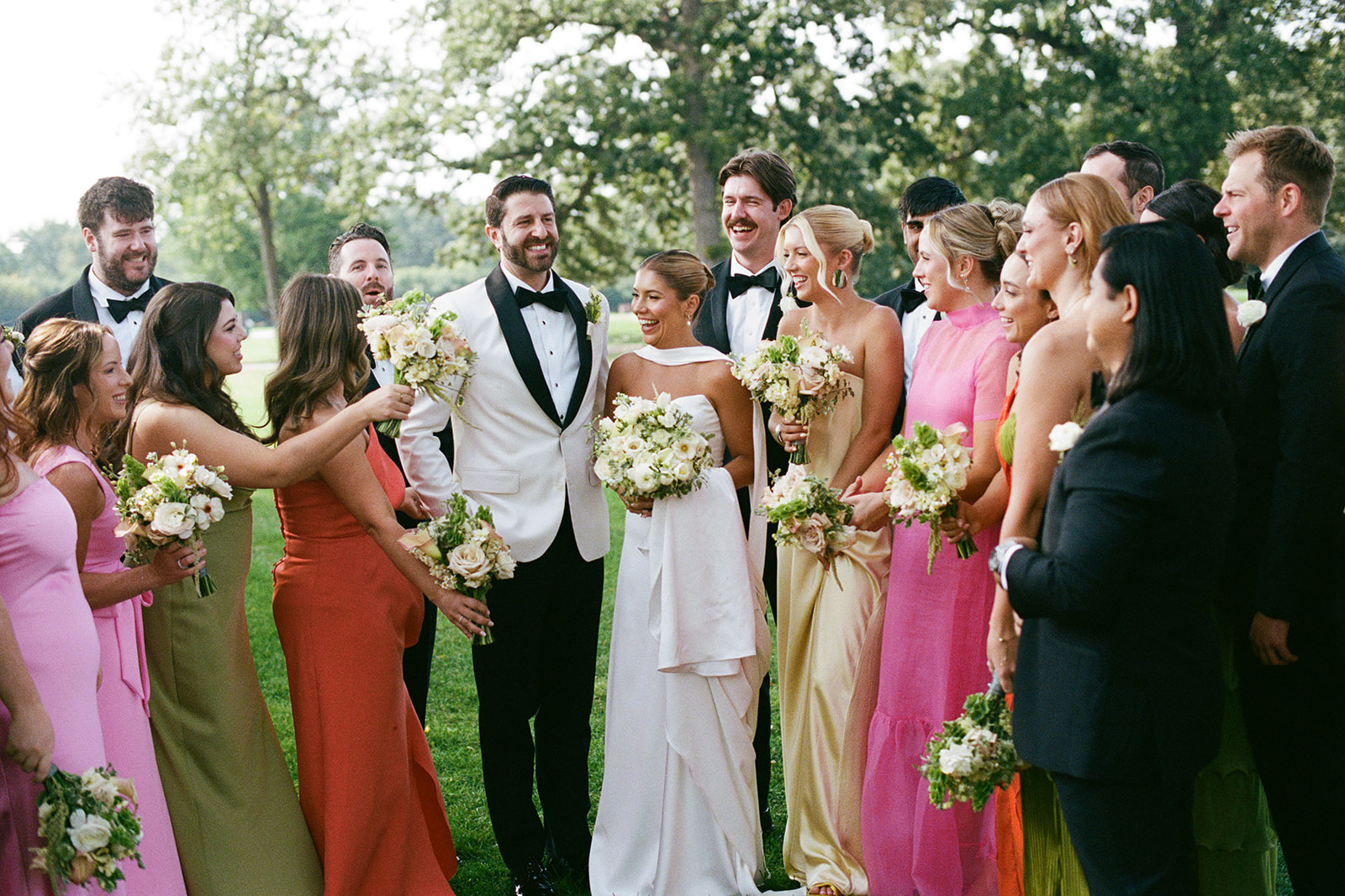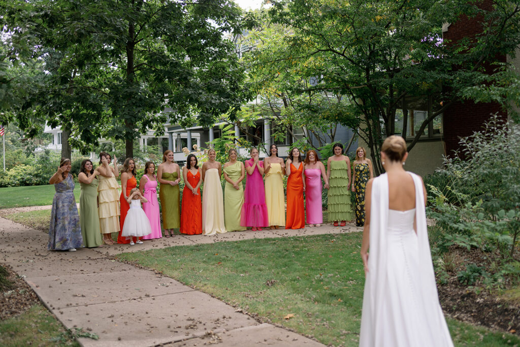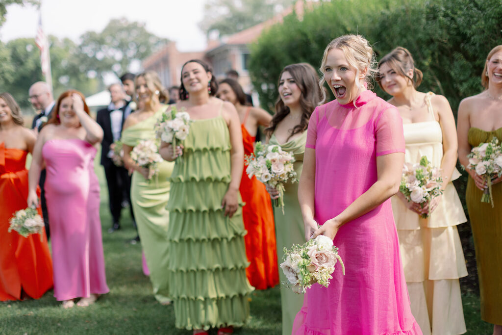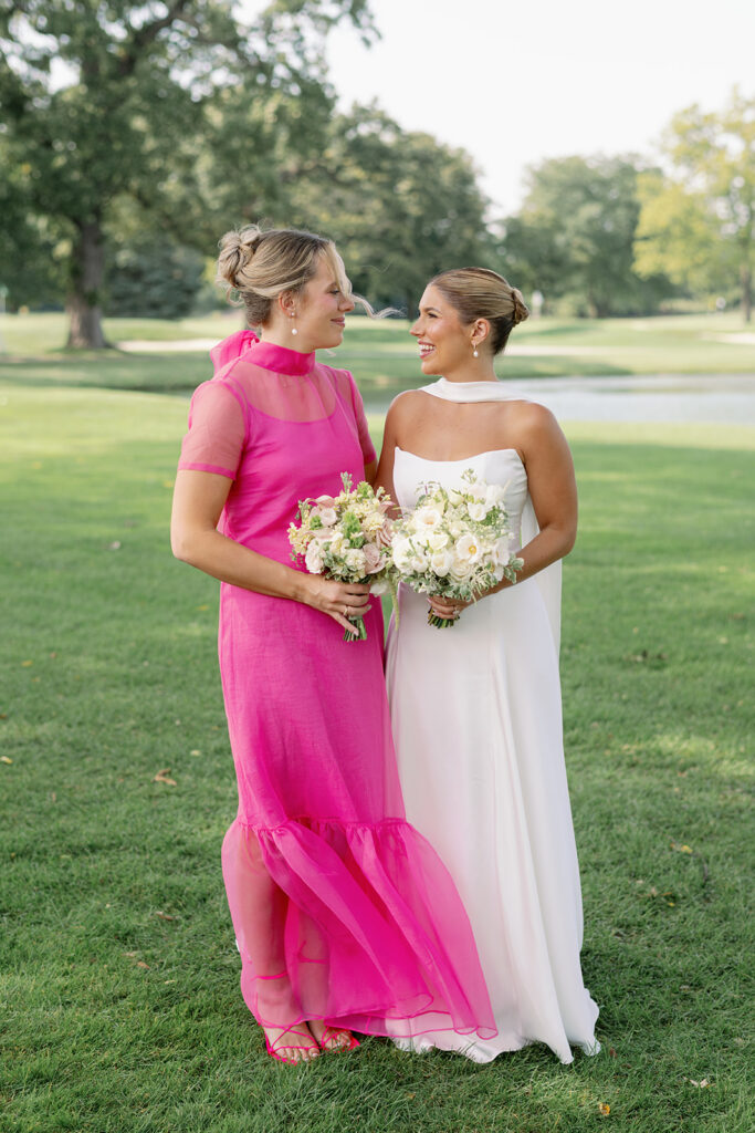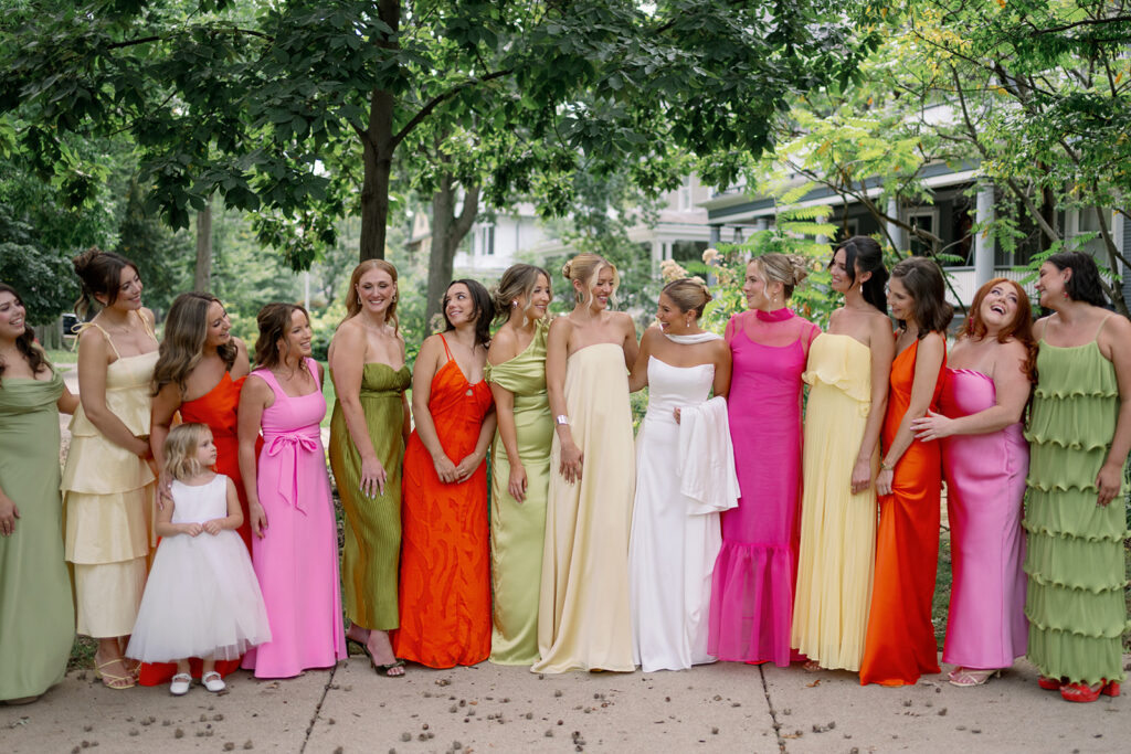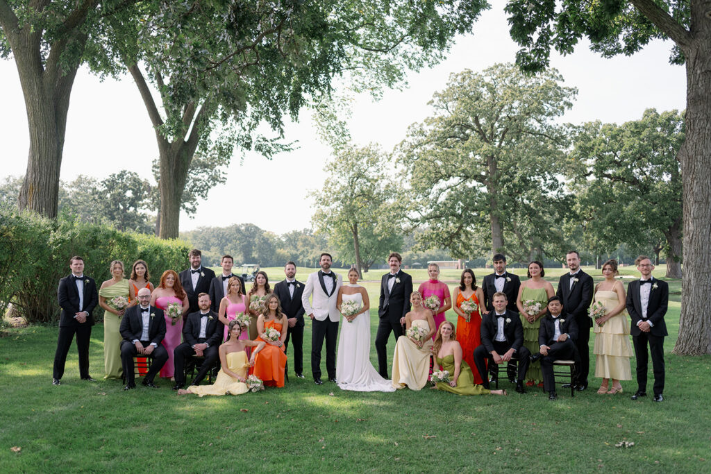 Mary and Miles’ Oak Park Country Club Wedding was the same weekend as my own the year prior, so this one felt special. Bold colors, big wedding parties, and a room filled with tangible joy. Over summer 2025, I was very fortunate to shoot so many color forward weddings, and this day was no exception. Sunset hues paired with perfect shades of lime and chartreuse? Perfection. Chartreuse is one of my favorite (and brand) colors, so anytime I get a bridesmaid dress in that perfect shade of green I am all over it.
