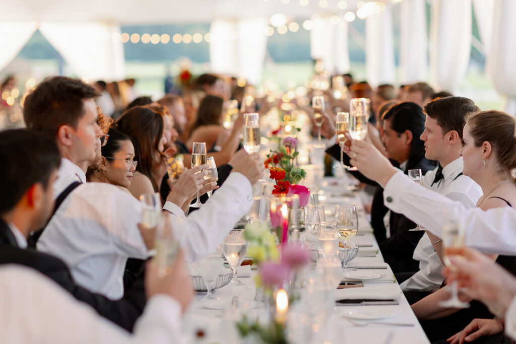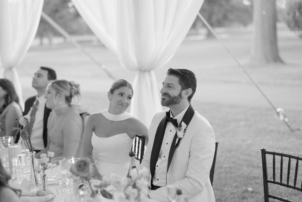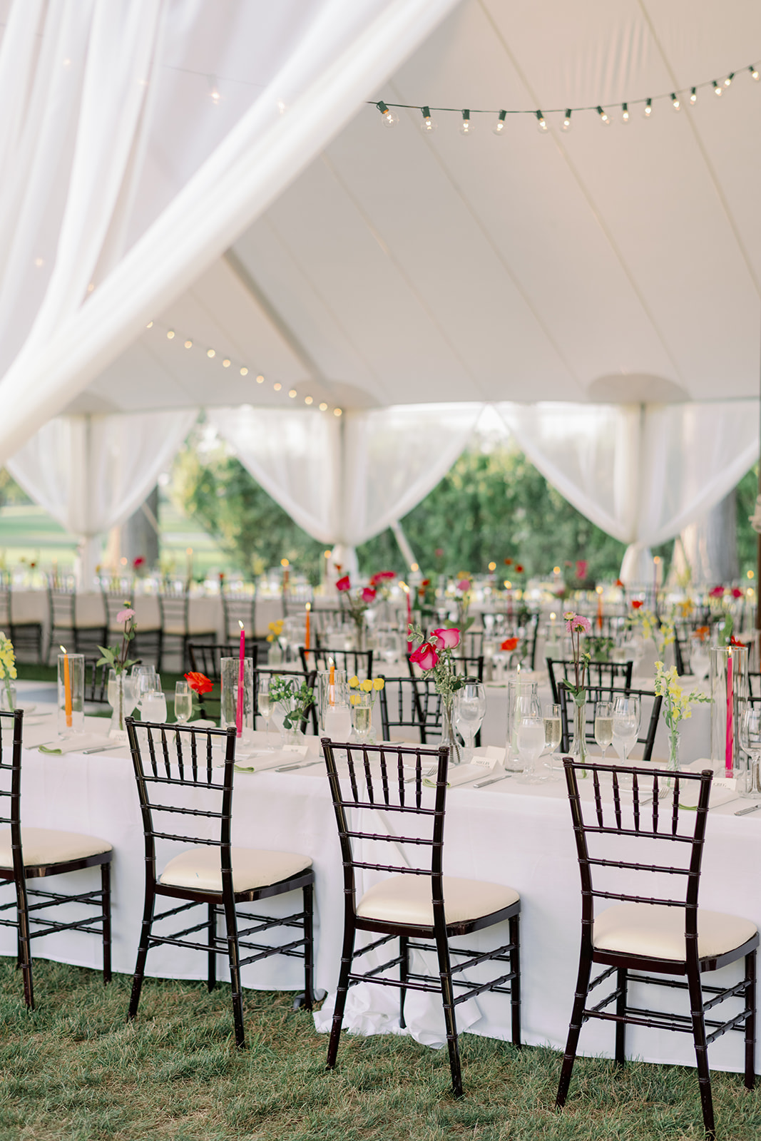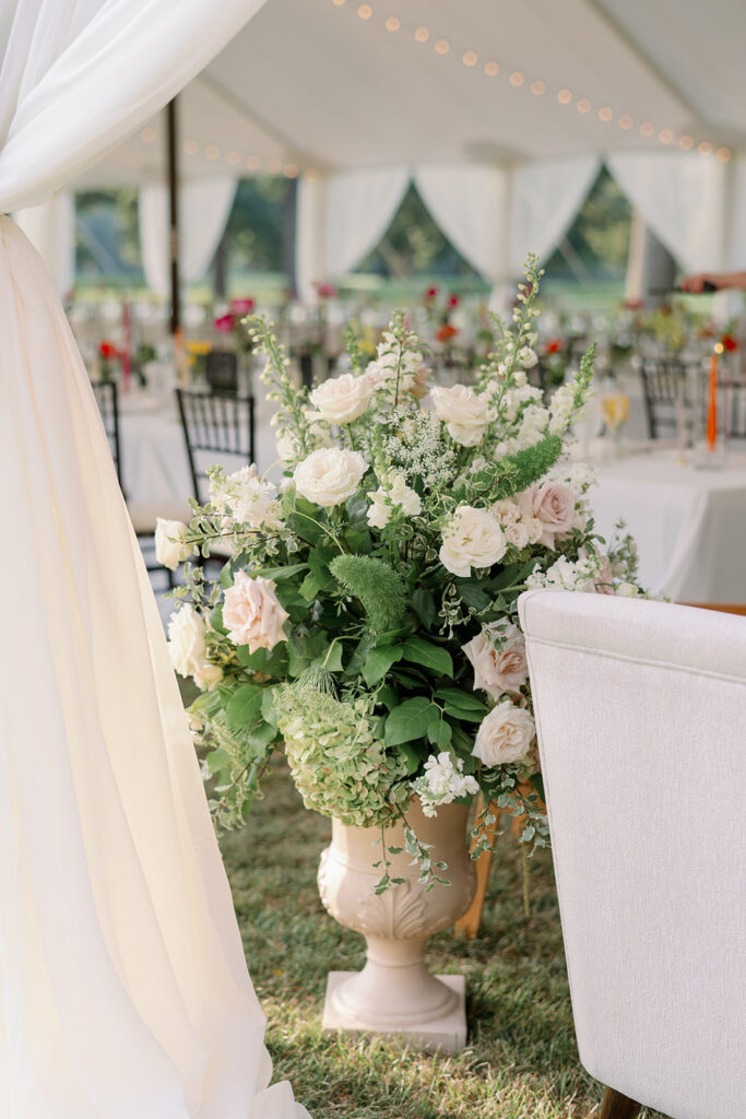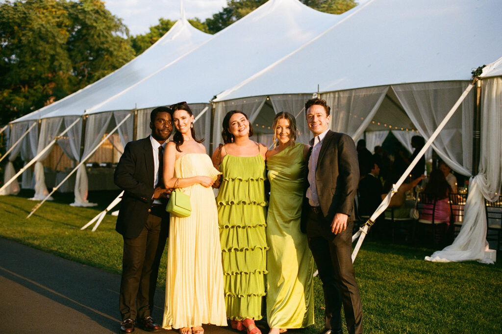 The ceremony took place at a small church in Oak Park, and the reception took place at Oak Park Country Club. While some may see a country club wedding and think stuffy ballroom and golf course photos, Mary and Miles opted to pitch a sail cloth tent at the club and it was perfect. If you know me, you know I am a big tent gal and had my own sail cloth tent wedding in 2024. There is something so dreamy and ethereal about a wedding reception under a tent. It makes me so happy that I have several tent weddings in 2026!