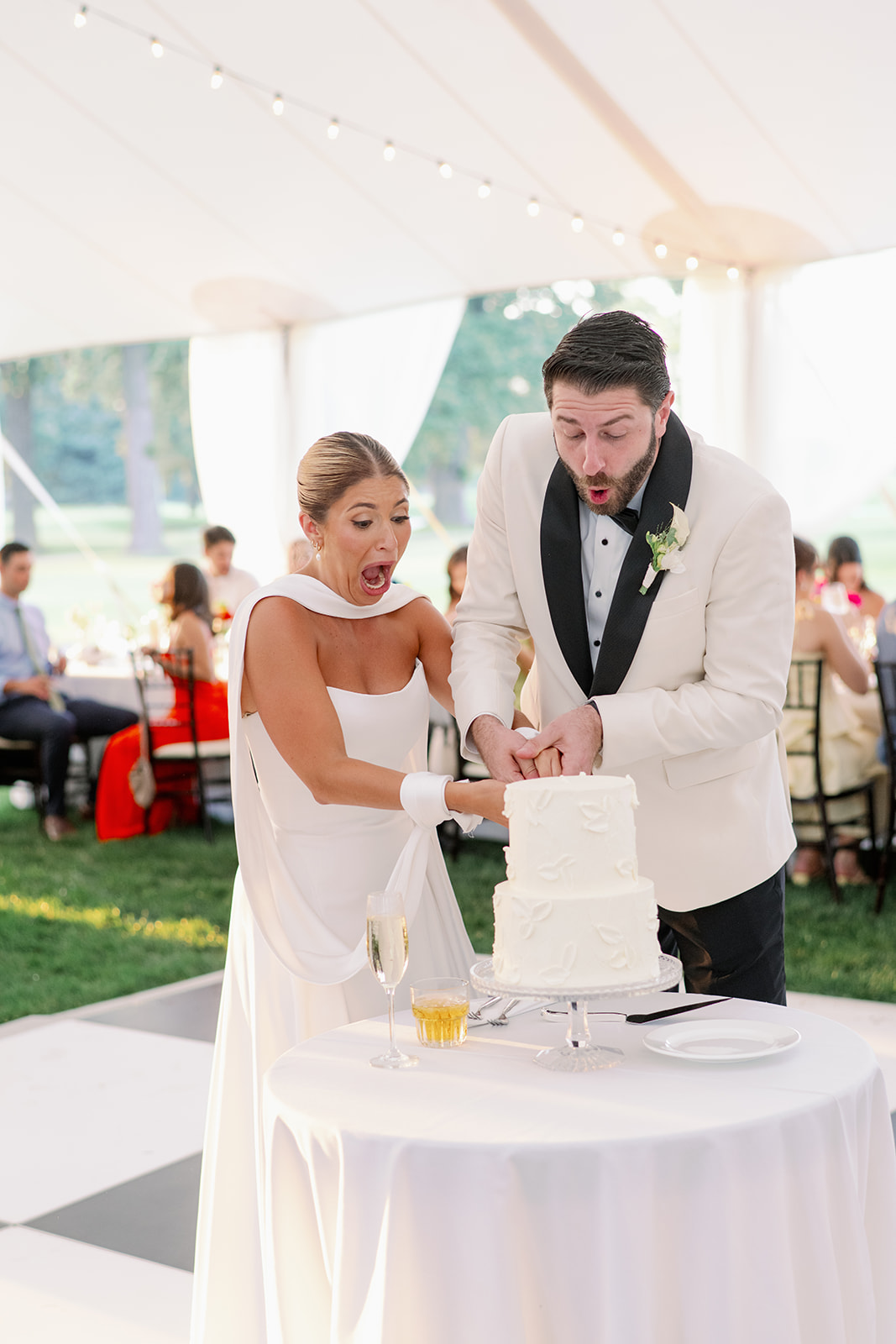 Planning: Bustle and Lace / Florals: Busy B’s Florals / Venue: Oak Park Country Club / HMUA: Anomalie Beauty Agency / Tent: Burns Special Events / Lighting: MK Lighting and Design / Linens: BBJ La Tavola / Cake: Sugar Fixe / Stationary: Fitzgerald’s Fine Stationary / Band: Blue Water Kings